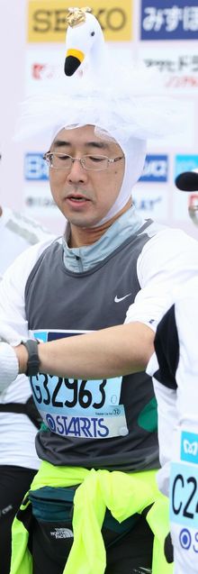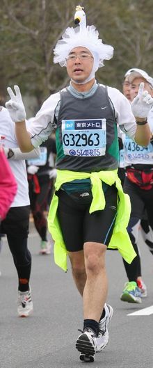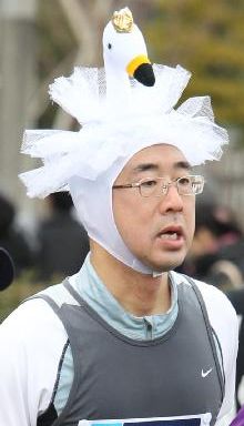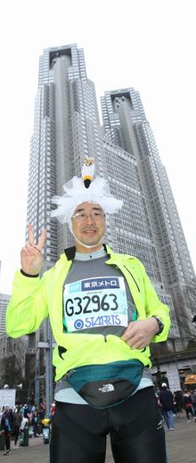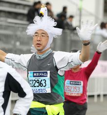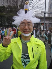 今回は、仲間数人が沿道で応援してくれるというので、目立つように、「白鳥」のカブリモノをかぶって走ることにしていた。
