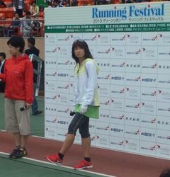 9:30になって、競技場のグラウンドに降りて、準備運動を兼ねた“谷川真理のランニング教室”が行われました。